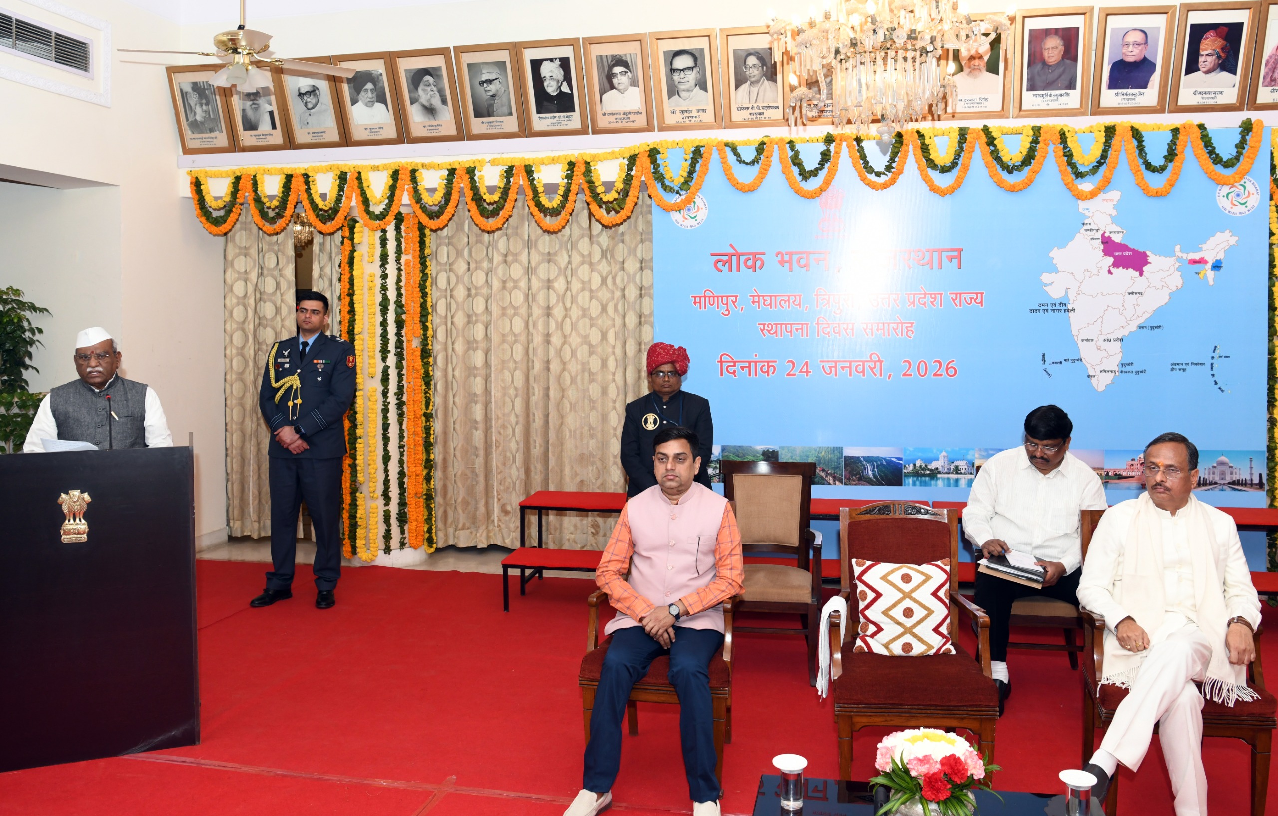 जयपुर। लोकभवन में शनिवार को उत्तरप्रदेश, त्रिपुरा, मेघालय और मणिपुर राज्यों का स्थापना दिवस मनाया गया। इस दौरान राज्यपाल श्री हरिभाऊ बागडे ने इन राज्यों के राजस्थान में रहने वाले निवासियों को बधाई और शुभकामनाएं देते हुए सभी को राष...