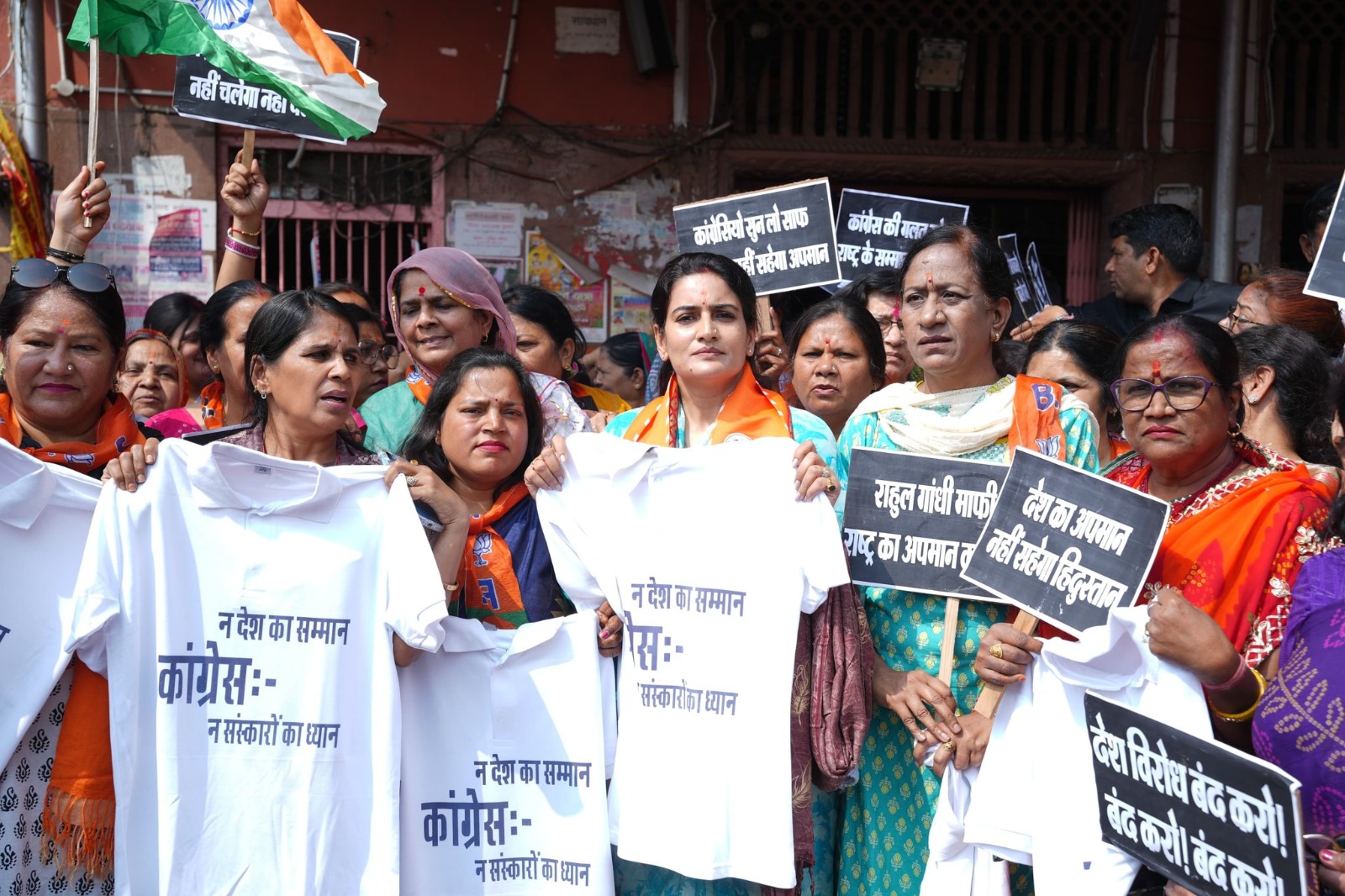 जयपुर। नई दिल्ली में एआई समिट के दौरान यूथ कांग्रेस द्वारा किए गए अशोभनीय एवं अर्धनग्न प्रदर्शन के विरोध में भाजपा महिला मोर्चा राजस्थान की प्रदेश अध्यक्ष राखी राठौड़ के नेतृत्व में बडी संख्या में महिलाओं ने चाँद पोल बाजार में सड़...