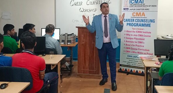 जयपुर। दी इंस्टीट्यूट ऑफ कॉस्ट अकाउंटेंट्स ऑफ इंडिया (ICAI) के जयपुर चैप्टर द्वारा एयर फोर्स स्कूल, जयपुर में सीएमए (कॉस्ट एंड मैनेजमेंट अकाउंटेंट) करियर काउंसलिंग कार्यक्रम का आयोजन किया गया। इसका उद्देश्य छात्रों को इस कोर्स के करियर विकल्पों के बारे में जागरूक करना था। कार्यक्रम के मुख्य करियर काउंसलर सीएमए हरेंद्र कुमार पारीक ने छात्रों को सीएमए कोर्स के बारे में विस्तार से जानकारी दी। उन्होंने बताया कि अगर कोई छात्र 12वीं कक्षा के बाद यह कोर्स ज्वाइन करता है, तो यह लगभग तीन साल में पूरा हो सकता है, जिसमें 15 महीने की अनिवार्य ट्रेनिंग भी शामिल है। उन्होंने छात्रों को उत्साहित करते हुए बताया कि वर्तमान समय में सीएमए को कैंपस प्लेसमेंट में 36 लाख रुपये तक के पैकेज के ऑफर मिल रहे हैं।