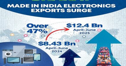 नई दिल्‍ली। देश के इलेक्ट्रॉनिक्स निर्यात में चालू वित्त वर्ष 2025-26 की पहली तिमाही में 47 फीसदी की तीव्र वृद्धि दर्ज हुई है। ये सालाना आधार पर बढ़कर 12.4 अरब अमरीकी डॉलर तक पहुंच गई। केंद्रीय वाणिज्य एवं उद्योग मंत्री पीयूष गोयल...
