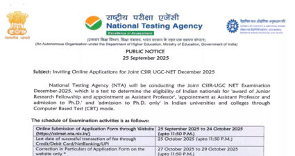 नई दिल्ली। राष्ट्रीय परीक्षा एजेंसी (NET) की ओर से जॉइंट सीएसआईआर यूजीसी नेट दिसंबर सेशन 2025 के लिए रजिस्ट्रेशन शुरू हो गए हैं। जो उम्मीदवार CSIR-UGC NET December 2025 परीक्षा की तैयारी कर रहे हैं, वे इस परीक्षा के लिए आवेदन कर स...