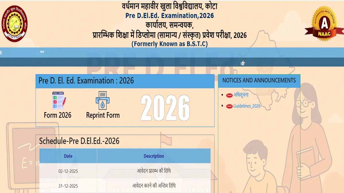 नई दिल्ली। राजस्थान प्री डीएलएड प्रवेश परीक्षा 2026 की तैयारियों में लगे छात्रों के लिए बड़ी खबर है। वर्धमान महावीर ओपन यूनिवर्सिटी की ओर से बीएसटीसी एडमिशन के लिए ऑनलाइन आवेदन प्रक्रिया आज यानी 2 दिसंबर से स्टार्ट कर दी गई है। इच्...