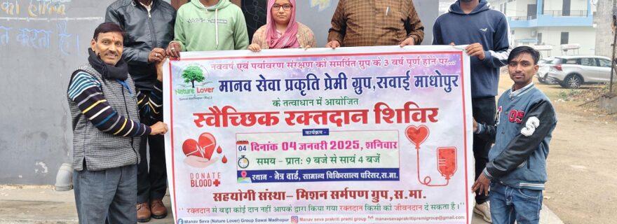 सवाई माधोपुर। मानव सेवा प्रकृति प्रेमी ग्रुप सवाई माधोपुर के तत्वावधान में नववर्ष एवं पर्यावरण संरक्षण को समर्पित ग्रुप के 3 वर्ष पूर्ण होने पर दिनांक 4 जनवरी 2025 को जिला अस्पताल के नेत्र वार्ड में आयोजित होने वाले स्वैच्छिक रक्तदान शिविर कार्यक्रम के पोस्टर का विमोचन वार्ड नं 23 से पार्षद एवं नगर परिषद् कार्यवाहक सभापति श्रीमती मेघा वर्मा के द्वारा ग्रुप के अध्यक्ष हनुमान सिंह नरूका की अध्यक्षता में किया गया।