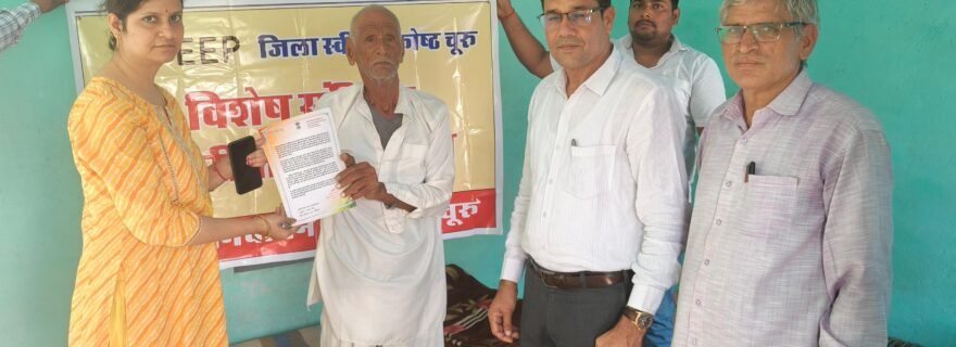 चूरू। जिला निर्वाचन अधिकारी एवं कलक्टर अभिषेक सुराणा के निर्देशानुसार मंगलवार को अंतरराष्ट्रीय वृद्धजन दिवस पर जिलेभर में शतायु मतदाताओं का सम्मान किया गया। इसी सिलसिले में अतिरिक्त जिला कलक्टर अर्पिता सोनी ने चूरू विधानसभा निर्वाचन क्षेत्र के गांव घंटेल के भाग संख्या 62 में 100 वर्षीय सांवताराम पुत्र परसाराम तथा एसडीएम बिजेंद्र सिंह ने भाग संख्या 60 में 102 वर्षीय रामेश्वरी पत्नी बजरंग दास को प्रमाण पत्र देकर सम्मानित किया।