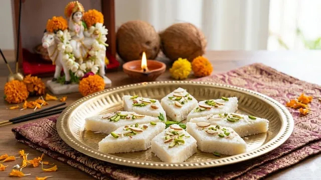 नई दिल्ली। चैत्र नवरात्र की अष्टमी के दिन मां महागौरी की पूजा की जाती है। मान्यता है कि देवी के इस स्वरूप की पूजा करने से सभी पापों का नाश होता है और जीवन के कष्ट और बाधाएं दूर होती हैं। ऐसी भी मान्यता है कि मां महागौरी को नारियल और उससे बनी मिठाइयों का भोग बेहद प्रिय है। इसलिए मां महागौरी की पूजा में आप नारियल की बर्फी का भोग चढ़ा सकते हैं। नारियल की बर्फी बनाना काफी आसान है और इसे काफी कम सामग्रियों के साथ भी बनाया जा सकता है। आइए जानें मां को भोग लगाने के लिए घर पर नारियल की बर्फी बनाने की रेसिपी।