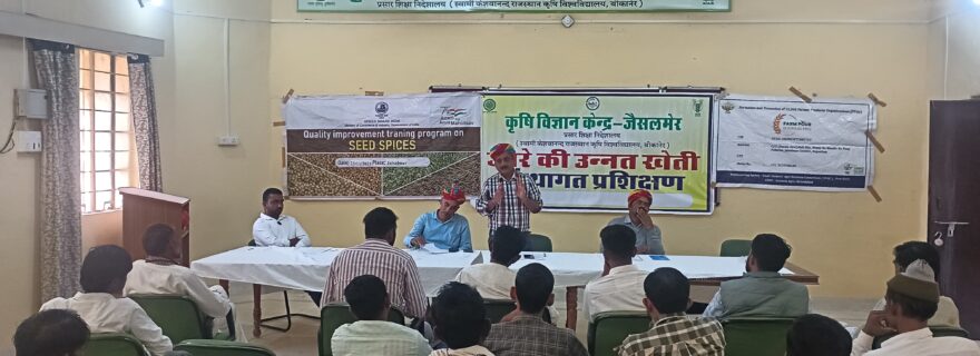 जैसलमेर। कृषि विज्ञानं केंद्र ,जैसलमेर एवं भारतीय मसाला बोर्ड के सयुक्त तत्वाधान में एक दिवसीय प्रशिक्षण का आयोजन किया गया जिसमे श्रेष्ठतम स्वर्ण नगरी के किसान उत्पादक संगठन के किसानो ने भाग लिया।