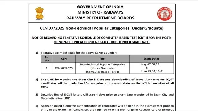 आरआरबी की आधिकारिक अधिसूचना के मुताबिक एनटीपीसी यूजी की परीक्षा 07, 08, 09 मई और 13, 14, 16 व 21 जून, 2026 को देशभर के विभिन्न परीक्षा केंद्रों में अलग-अलग शिफ्ट में संचालित की जानी है। एनटीपीसी यूजी सीबीटी-1 की परीक्षा कंप्यूटर मोड में आयोजित कराई जाएगी।
