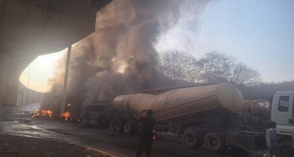 भीलवाड़ा । राजस्थान के भीलवाड़ा में शुक्रवार सुबह बड़ा हादसा हो गया। जिले के मांडलगढ़ के लाडपुरा चौराहे पर तेज गति से आ रहे सीमेंट के टैंकर ने आगे चल रहे टैंकरों को टक्कर मार दी।टक्कर के कारण तीन गाड़ियों में भीषण आग लग गई, जिससे मौके पर अफरा-तफरी मच गई। टैंकर चालक आग की चपेट में आ गया और जिंदा जलकर उसकी दर्दनाक मौत हो गई। हादसे के बाद हाइवे पर लंबा जाम लग गया, जिससे ट्रैफिक जाम हो गया।हादसे की सूचना मिलने ही मांडलगढ़ थाना पुलिस और दमकलकर्मी मौके पर पहुंचे। दमकलकर्मियों ने कड़ी मशक्कत के बाद आग पर काबू पाया, लेकिन तब तक टैंकर जलकर खाक हो चुके थे।