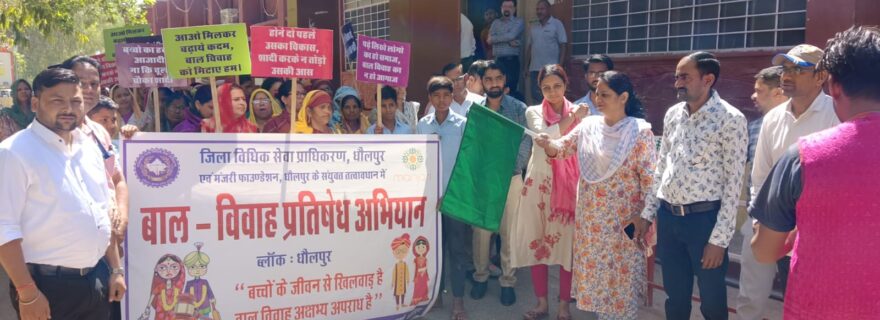 धौलपुर। राष्ट्रीय विधिक सेवा प्राधिकरण नई दिल्ली एवं राजस्थान राज्य विधिक सेवा प्राधिकरण जयपुर द्वारा प्रेषित एक्शन प्लान की पालना में तथा अध्यक्ष, जिला विधिक सेवा प्राधिकरण, धौलपुर के निर्देशानुसार, राष्ट्रीय बाल संरक्षण आयोग एवं अध्यक्ष जिला बाल संरक्षण इकाई जिला कलक्टर के मार्गदर्शन में सचिव जिला विधिक सेवा प्राधिकरण रेखा यादव द्वारा मंजरी फाउंडेशन एवं जिला प्रशासन के सहयोग से जिला कलेक्ट्रेट से सिटी जुबली हॉल धौलपुर तक बाल विवाह प्रतिषेध रैली को हरी झंडी दिखाकर रवाना किया। जिसमें बाल अधिकारिता विभाग के सहायक निदेशक मनीराम शर्मा, बाल कल्याण समिति की अध्यक्ष मधु शर्मा, महिला अधिकारिता विभाग के कर्मचारी, समाज कल्याण के कर्मचारी, बाल अधिकारिता विभाग के कर्मचारी महिला एवं बाल विकास विभाग के कर्मचारी, मंजरी फाउंडेशन के कर्मचारी, शिक्षा विभाग से कर्मचारी, पुलिस विभाग के अधिकारी एवं कर्मचारी, जिला प्रशासन के कर्मचारी आदि उपस्थित रहे। जिसमें रेखा यादव द्वारा रैली में उपस्थित महिलाओं को बताया कि हमारे समाज में बहुत सी कुरीतियां हैं उन्हीं में से एक है बाल विवाह। बाल विवाह का अर्थ है यदि बालिका की उम्र 18 वर्ष और यदि बालक की उम्र 21 वर्ष से कम हो तो वह बाल विवाह है। बाल-विवाह बच्चे के उज्जवल भविष्य के लिए घातक है आदि के बारे में विस्तार से बताया। रैली में 70 महिलाएं उपस्थित रही।
