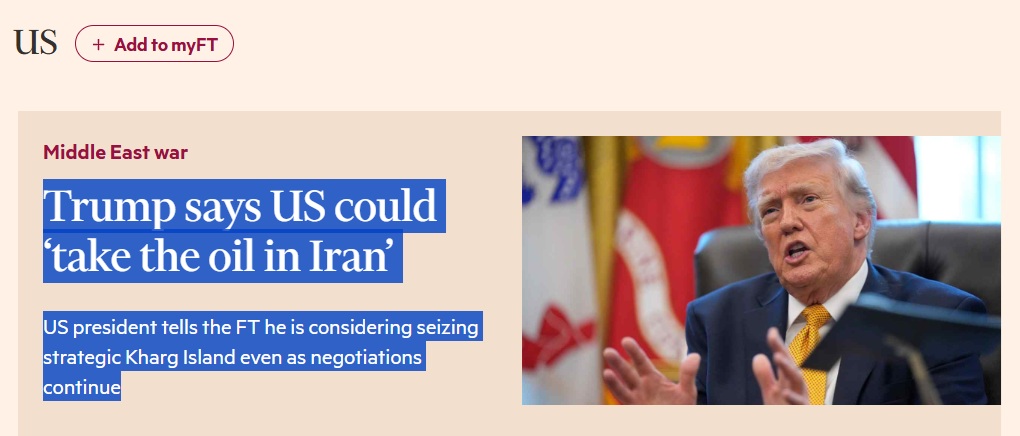 अमेरिका के फाइनेंशियल टाइम्स ने सोमवार को रिपोर्ट दी कि ट्रंप ने इंटरव्यू में कहा कि ईरान के साथ युद्ध में उनका पसंदीदा विकल्प “तेल पर कब्जा करना” होगा। उन्होंने इसकी तुलना वेनेज़ुएला में अमेरिका की योजनाओं से की। उनका दावा है कि निकोलस मादुरो को हटाने के बाद वाशिंगटन का लक्ष्य लंबे समय तक तेल क्षेत्र को नियंत्रित करना है।