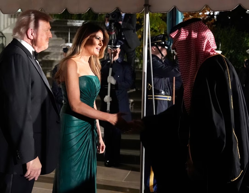 रात्रिभोज पर पहुंचे सऊदी अरब के क्राउन प्रिंस मोहम्मद बिन सलमान का स्वागत काले रंग का टक्सीडो पहने ट्रंप और पन्ना रंग का गाउन पहने प्रथम महिला मेलानिया ट्रंप ने साउथ लॉन के प्रवेश द्वार पर किया। इस दौरान एक सैन्य बैंड ने स्वागत ध्वनि बजाई। व्हाइट हाउस के ईस्ट रूम में दिए गए रात्रिभोज में उपराष्ट्रपति जेडी वेंस और उनकी पत्नी उषा, टेक अरबपति एलन मस्क, फॉक्स न्यूज के होस्ट ब्रेट बैयर, डोनाल्ड ट्रंप जूनियर, फीफा अध्यक्ष जियानी इन्फेंटिनो, हाउस स्पीकर माइक जॉनसन, युद्ध सचिव पीट हेगसेथ, ट्रेजरी सचिव स्कॉट बेसेंट, एप्पल के सीईओ टिम कुक और अमेरिकी लघु व्यवसाय प्रशासन की प्रशासक केली लोफ्लर भी नजर आए।